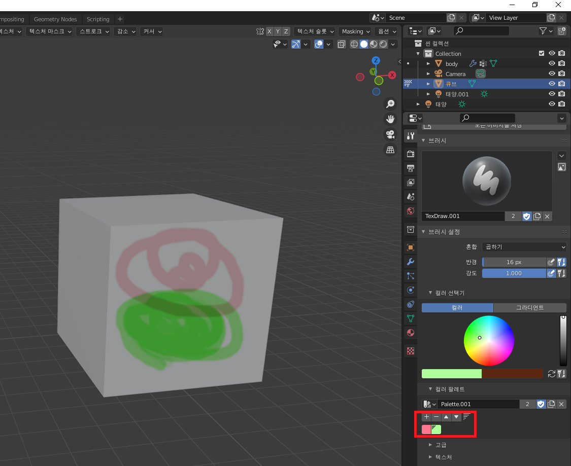 위 이미지를 참고해서 보시면, 왼쪽(연두색), 오른쪽(갈색)으로 설정이 되어있습니다. 여기서 텍스쳐에 칠해지는 브러시 색상은 왼쪽(연두색)이 적용됩니다.