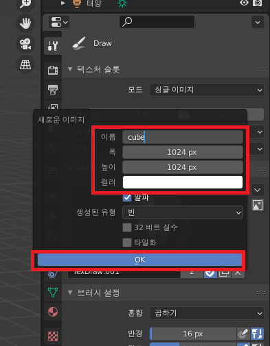 니다. 설정 후, ok를 눌러 텍스쳐를 생성해 준 뒤, 브러시로 작업을 하면 됩니다.
