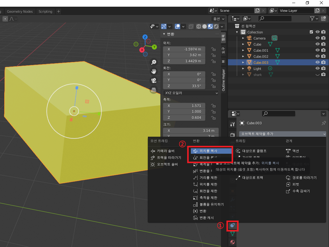 이동하고자 하는 오브젝트(노란) 선택 후, '오브젝트 제약 프로퍼티스'(①)로 이동, '위치를 복사' (②) 클릭해줍니다.