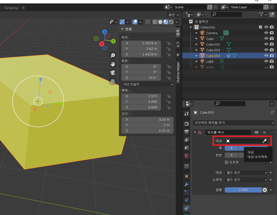 → '대상' 에 복사하고자 하는 오브젝트(빨간 box)를 클릭