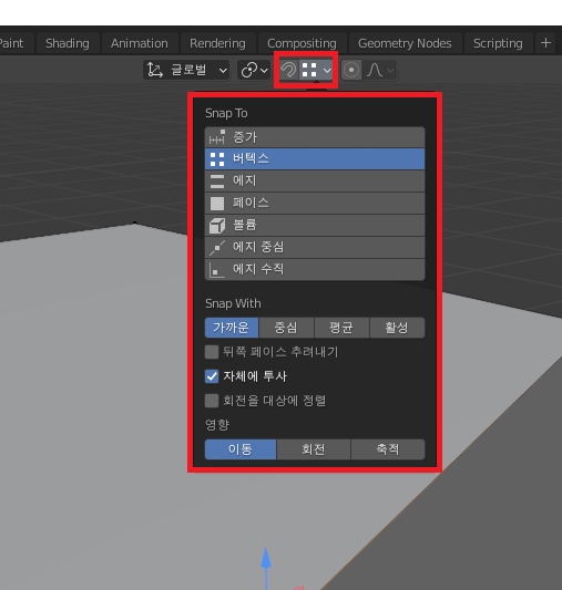 엣지 중심 - 스냅하려는 엣지에 중심 부분을 찾아 스냅시켜줌