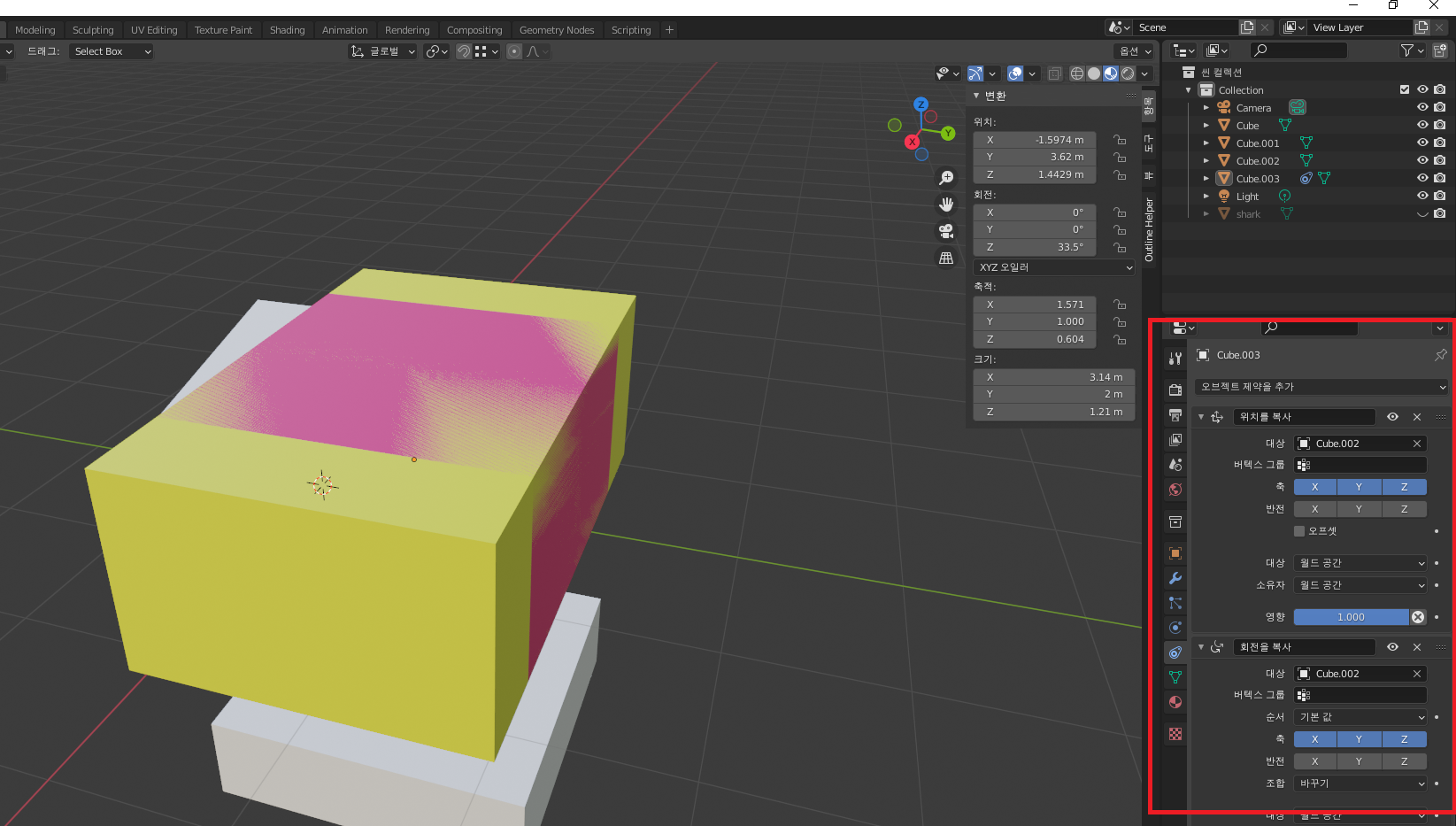 이때, 위 '위치를 복사' 와 같은 방법으로 '회전을 복사' 해줍니다.
