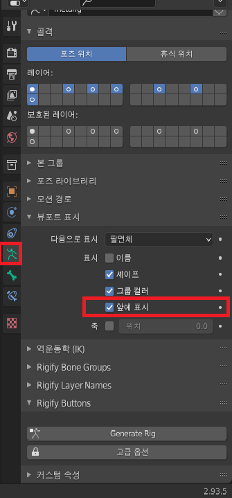 ③ 만들어진 본 클릭 → '오브젝트 데이터 프로퍼티스' →뷰포트 표시 → '앞에 표시'를 활성화해줍니다