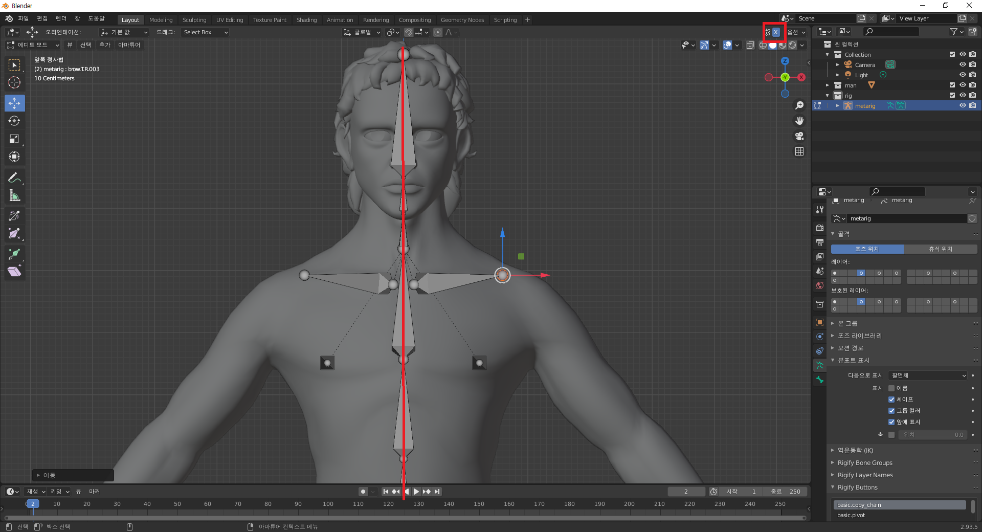 이때, 몸에 맞게 본을 위치해주는데, 오른쪽 상단의 x를 활성화시켜, mirror 모드 해줍니다.