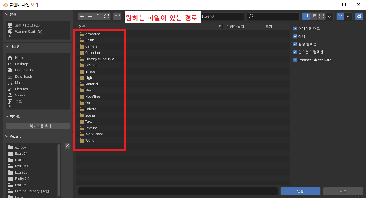 2. 원하는 파일이 있는 경로 입력 후 원하는 블랜더 파일을 클릭해 연결