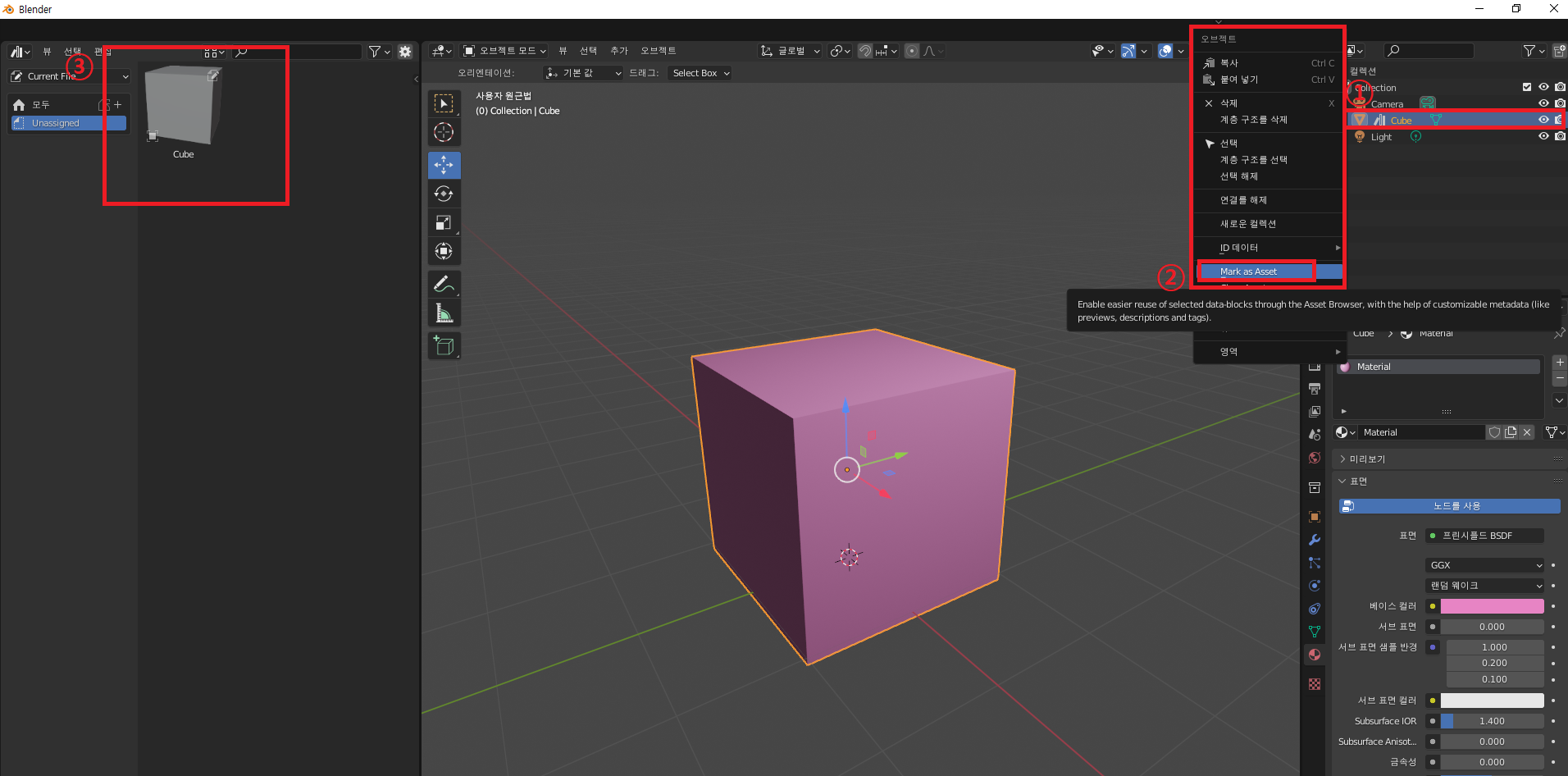 원하는 mesh 선택 후, 마우스 오른쪽(①) → Mark as Asset(②) → asset browser에 등록됨(③)