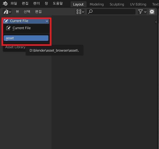 경로 지정 후, asset browser 창에서 Current File 선택 → asset(등록한 경로 이름) 클릭시, 원하는 경로의 asset browser 창이 열림