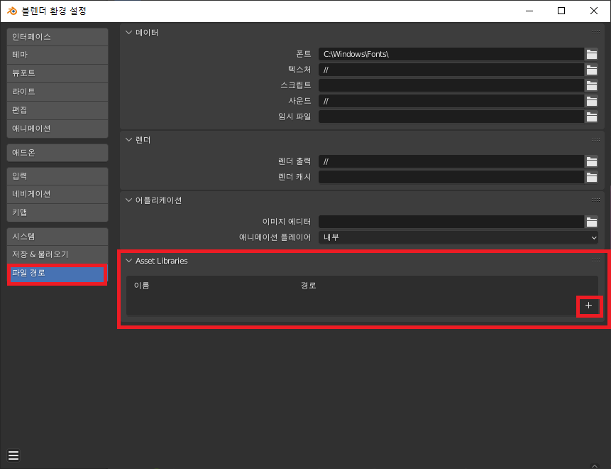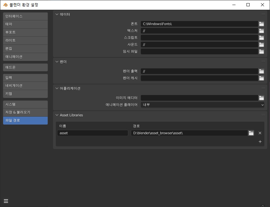 블랜더 환경설정 → 파일 경로 → Asset Libraies → '+' 아이콘 클릭 (asset browser 경로 지정)