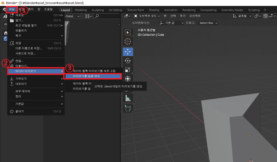 블랜더 3.0 설치 후, 위쪽 아이콘(에디터 유형) 클릭 → Asset Browser 클릭
