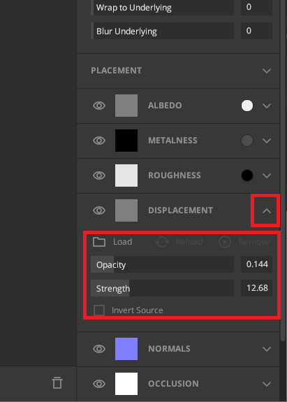 또, 화살표 눌러주게 되면 디스맵, 알베도 여러 PLACEMENT에 있는 맵들을 OPACITY, CONTRAST, STRENGTH 등 손쉽게 조절이 가능합니다. 이때, 만들어주는 Solid 레이어의 위치가 중요하므로 주의해서 만들어 줍니다.