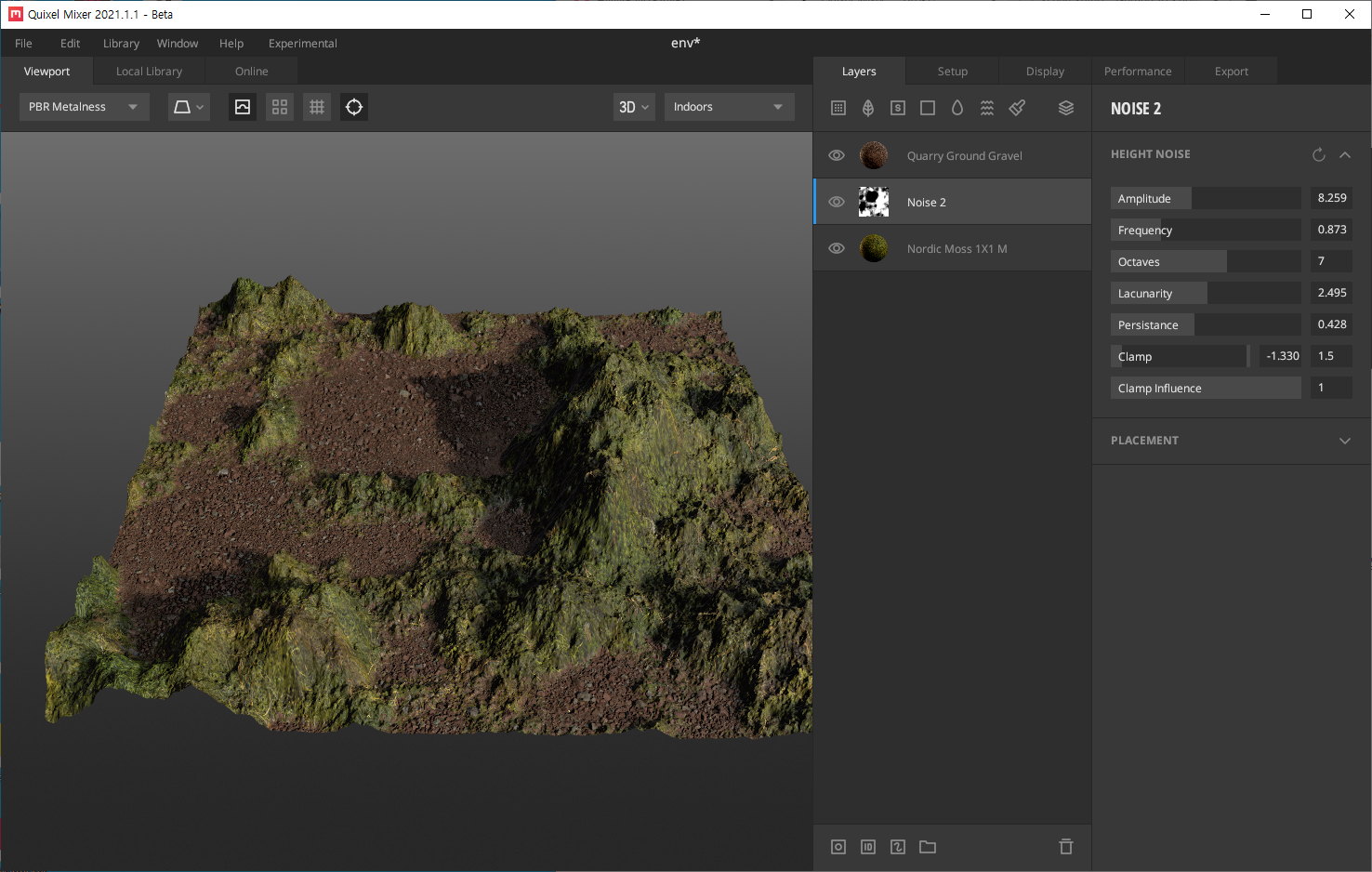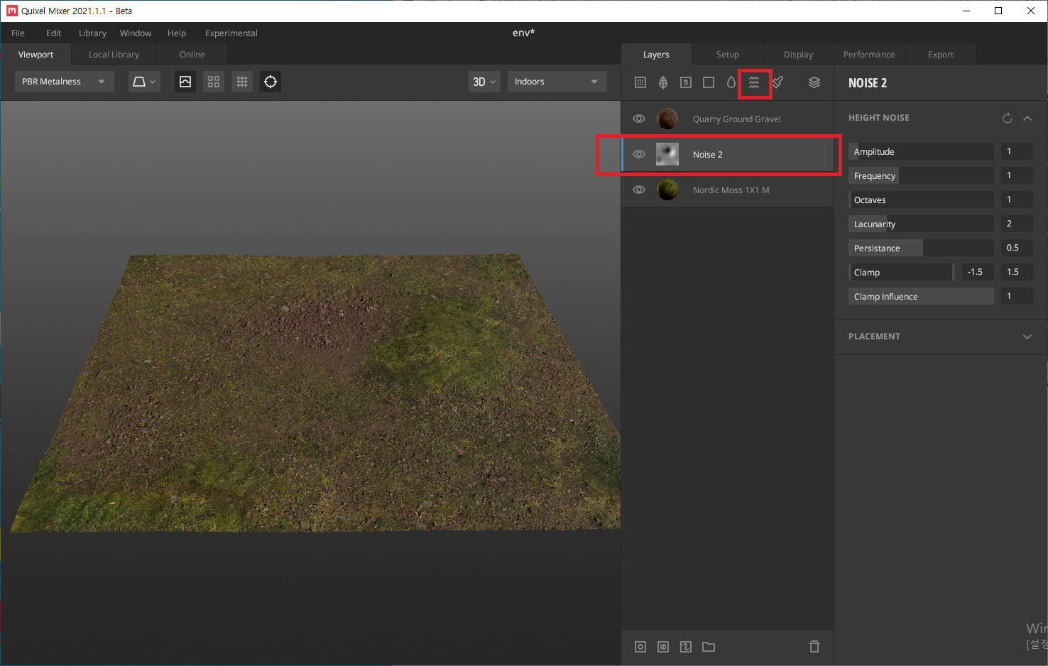 오른쪽에 있는 'HEIGHT NOISE' Amplitude 와 Frequency, Octaves, Lacunarlity.....등등을 조절해서 위 이미지 처럼 noise 레이어 아래에 있는 'Nordic Moss' 쉐이더를 산 처럼 우뚝 솟게 만들 수도 있습니다.